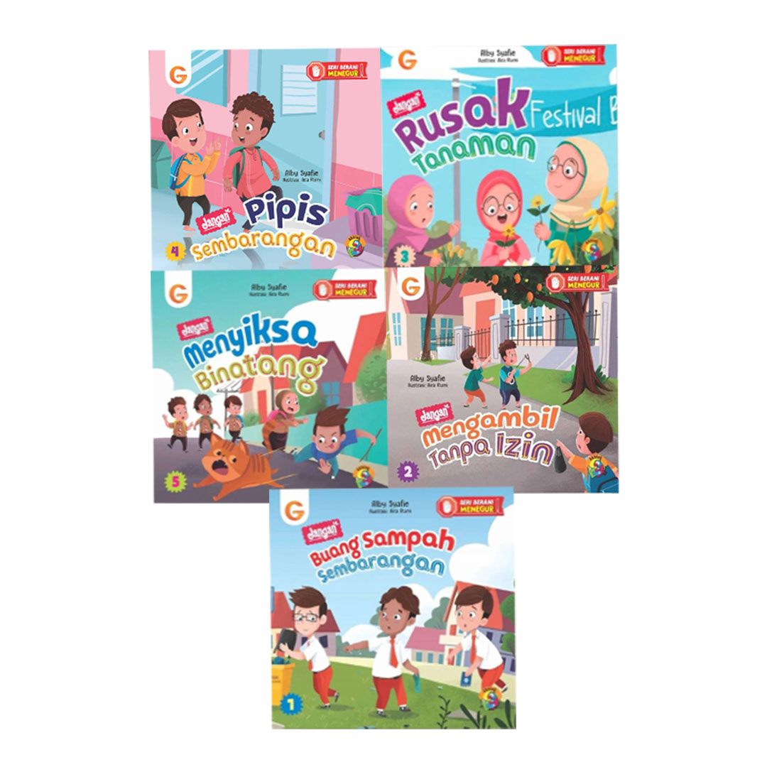 Buku cerita anak islami bergambar Set Seri Berani Menegur menghadirkan lima buku cerita anak islami tentang pentingnya menegur untuk menjaga, merawat, menyayangi sesama makhluk hidup melalui cerita seru dan menyenangkan!
